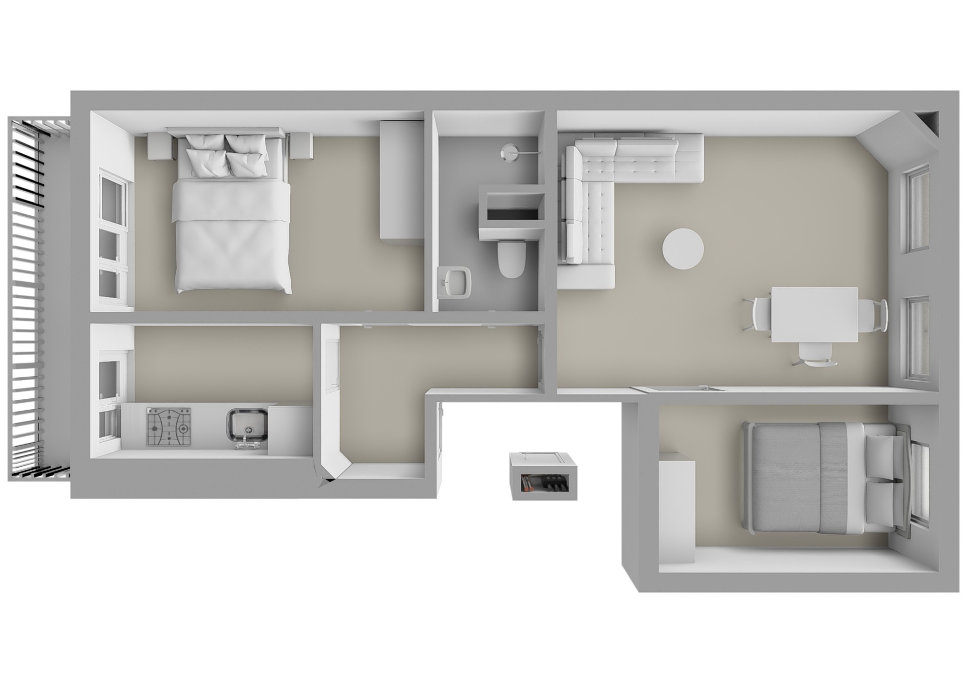 With a small modification, part of the living/dining room can also be converted into a second bedroom. This makes the apartment ideal for a home office, guest room, or family expansion. (See alternative room layout.)