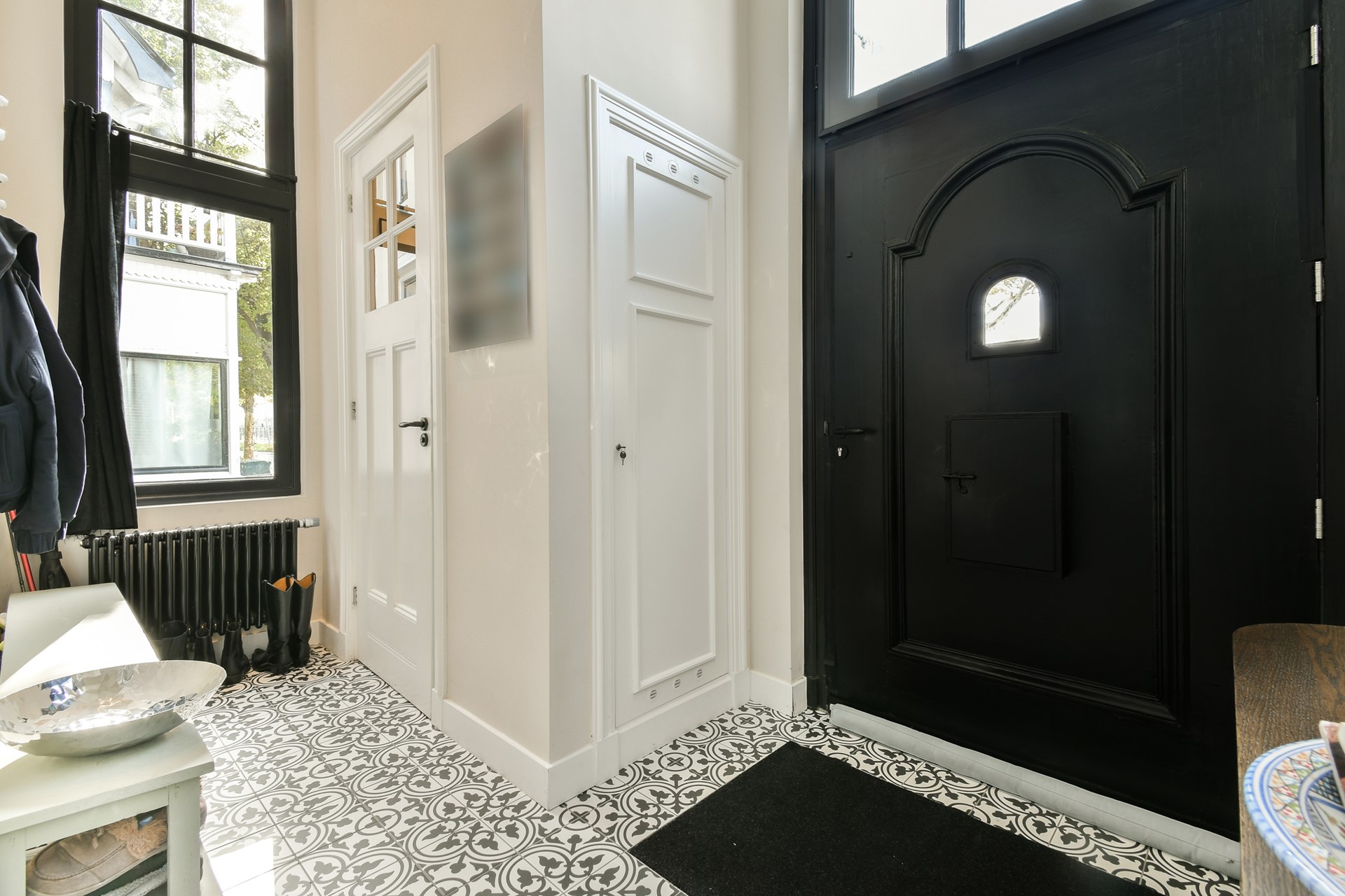 Entrance hall with access to the separate toilet with washbasin and meter cupboard with extra storage space. The entrance hall leads to a beautiful spacious hall, from where you can reach all the rooms on the ground floor.