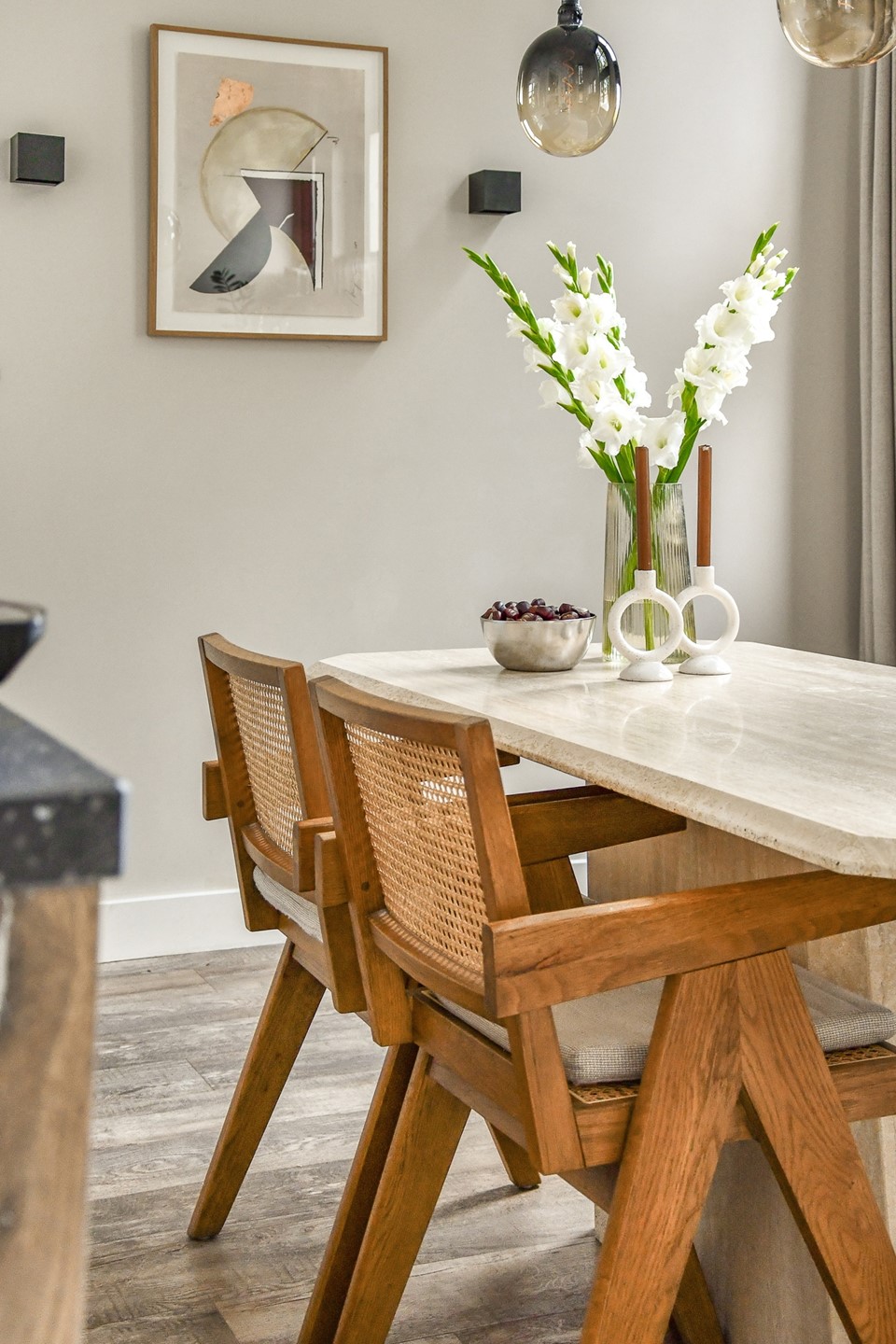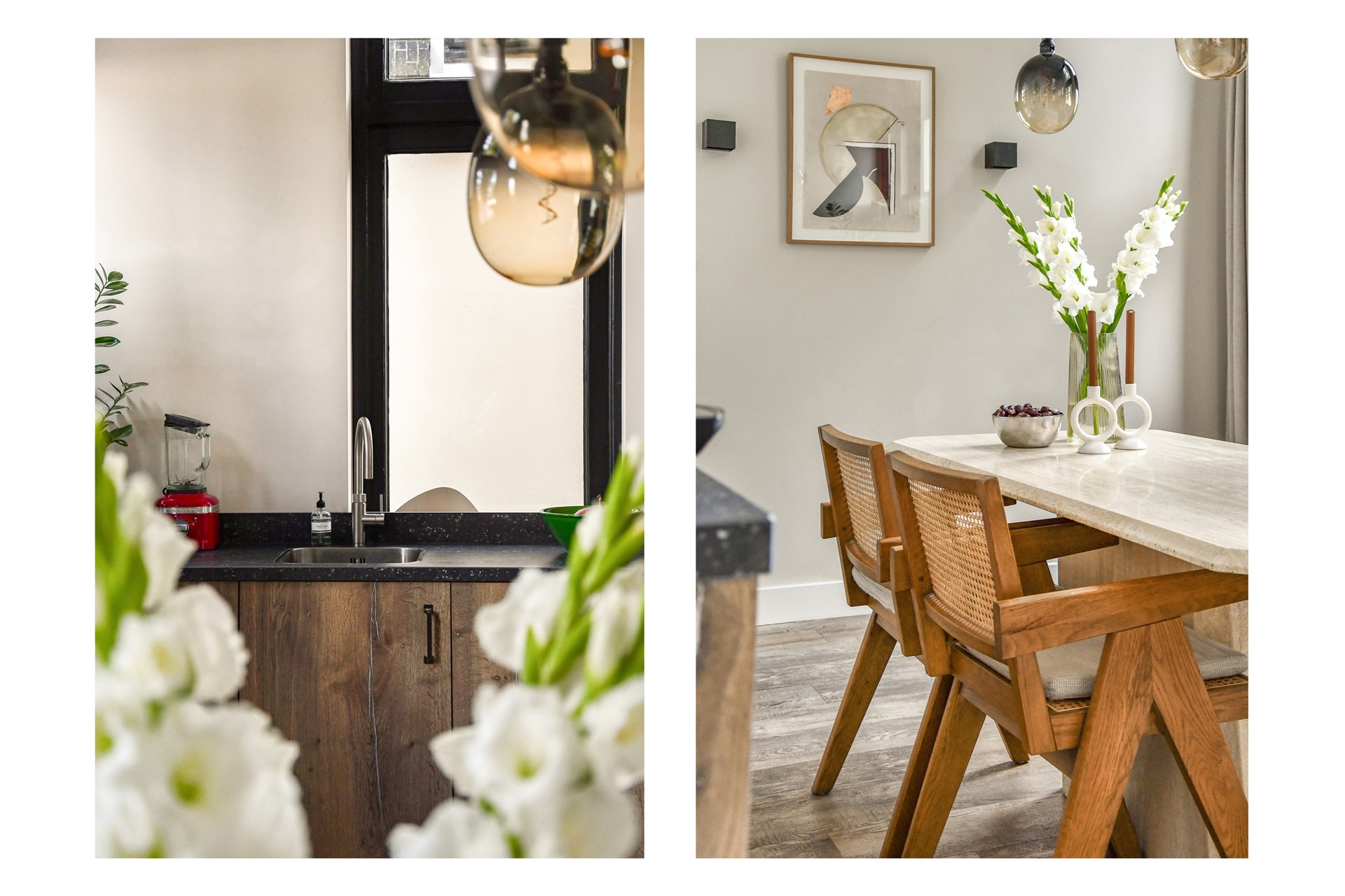 The spacious living room is located at the front of the house and opens onto the luxurious kitchen, which is equipped with high-end built-in appliances.