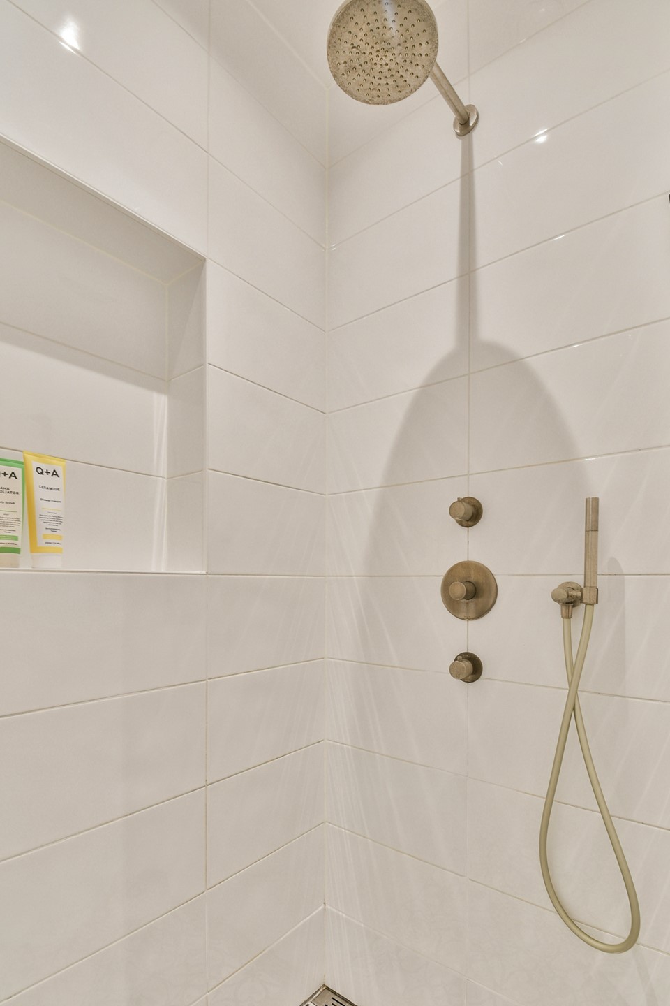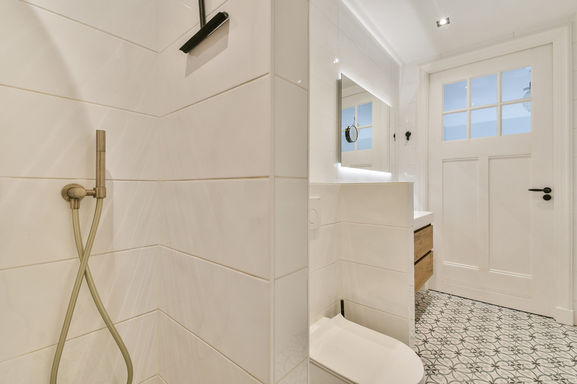 Bathroom with double sink and bathroom cabinet, floating toilet, and spacious walk-in rain shower.