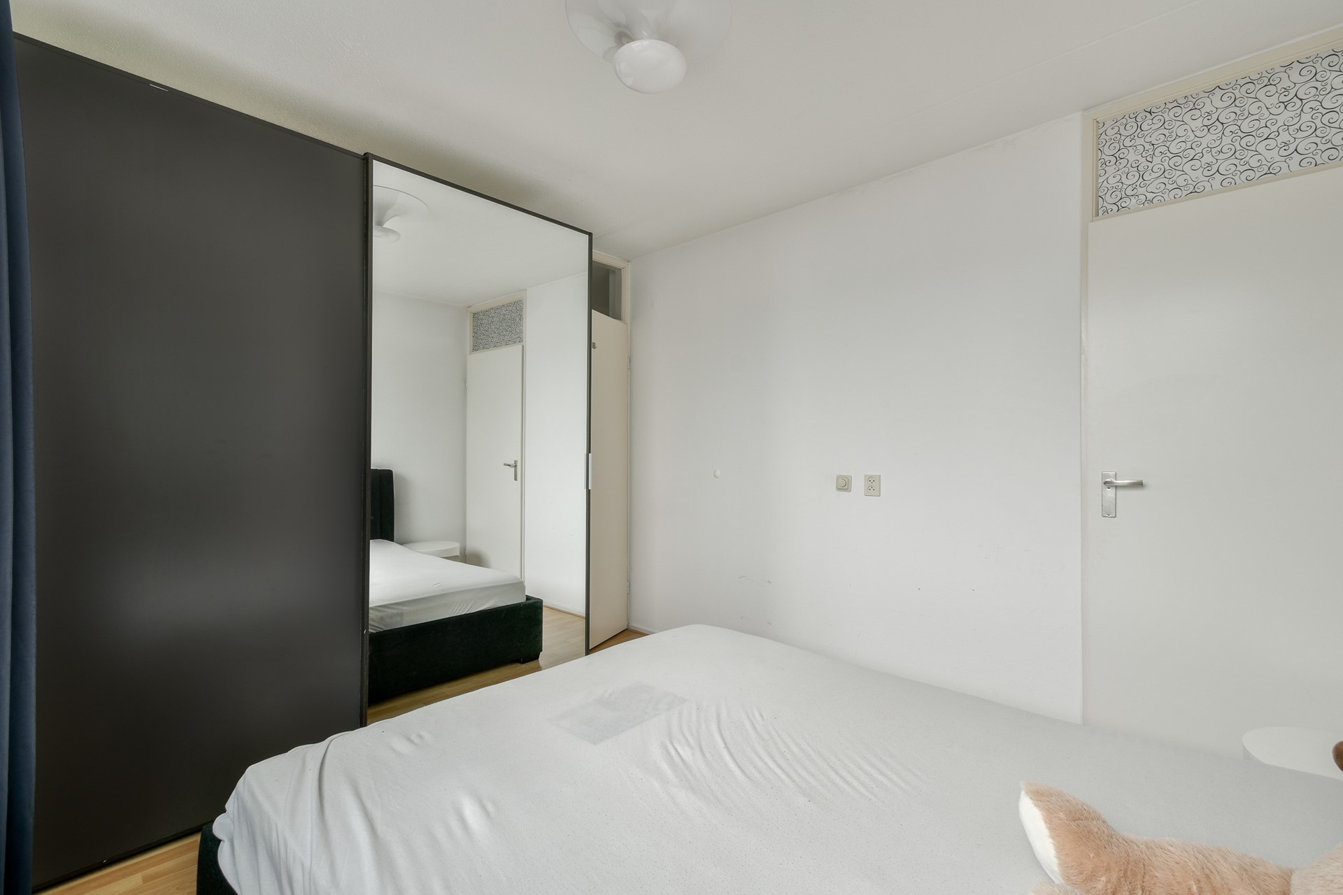De slaapkamer biedt ruimte voor een groot bed, kasten en eventueel een werkplek.