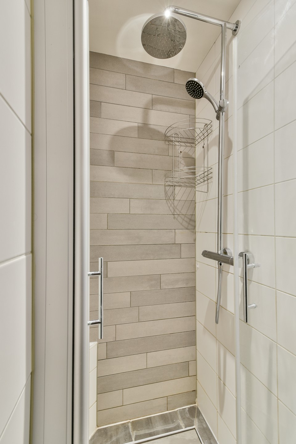 De badkamer beschikt over een inloopdouche, toilet, wastafelmeubel en aansluiting voor de wasmachine.