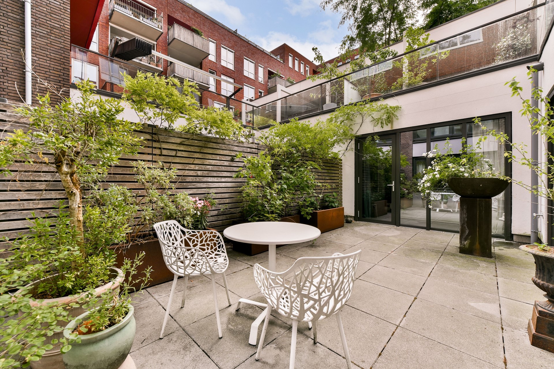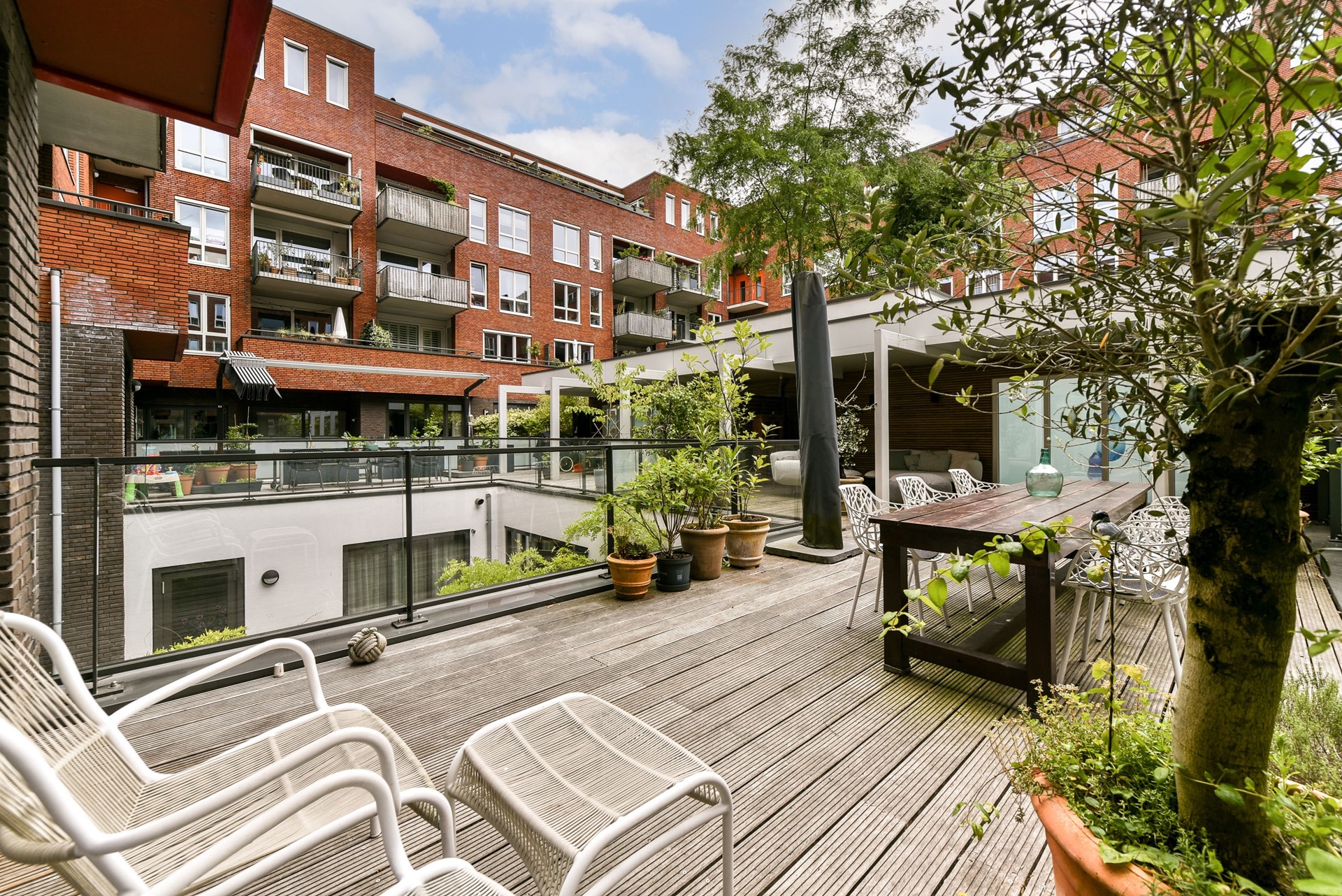 Vanaf deze plek heb je zicht op de lagergelegen prive-tuin, alsmede op de achterkamer van het appartement.