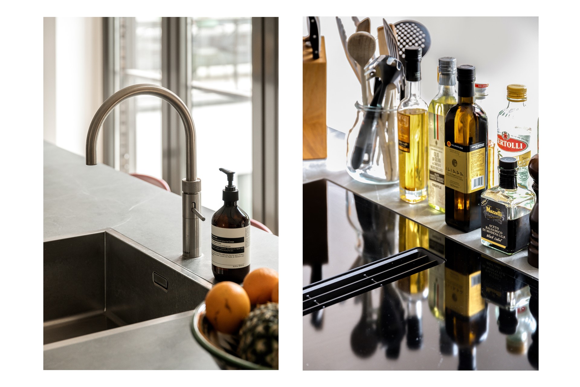 In het midden van het huis is de grote open woonkeuken (Siematic) geplaatst, uitgerust met diverse inbouwapparatuur zoals een combi-oven, een vaatwasser, een inductiekookplaat met geïntegreerde afzuiginstallatie, een koel-vriescombinatie en een Quooker.