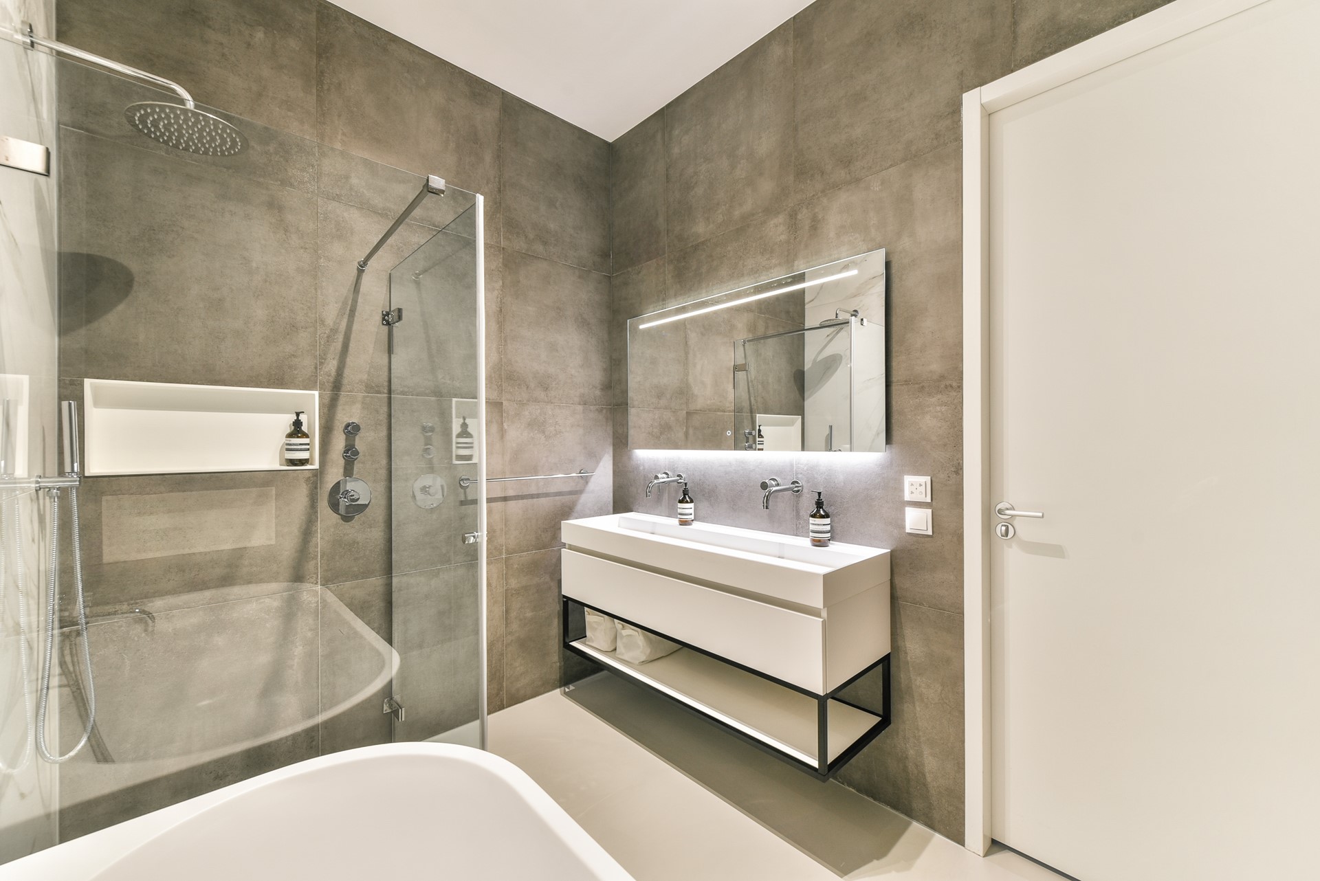 Badkamer met een ligbad, inloopdouche en een dubbele wastafel.