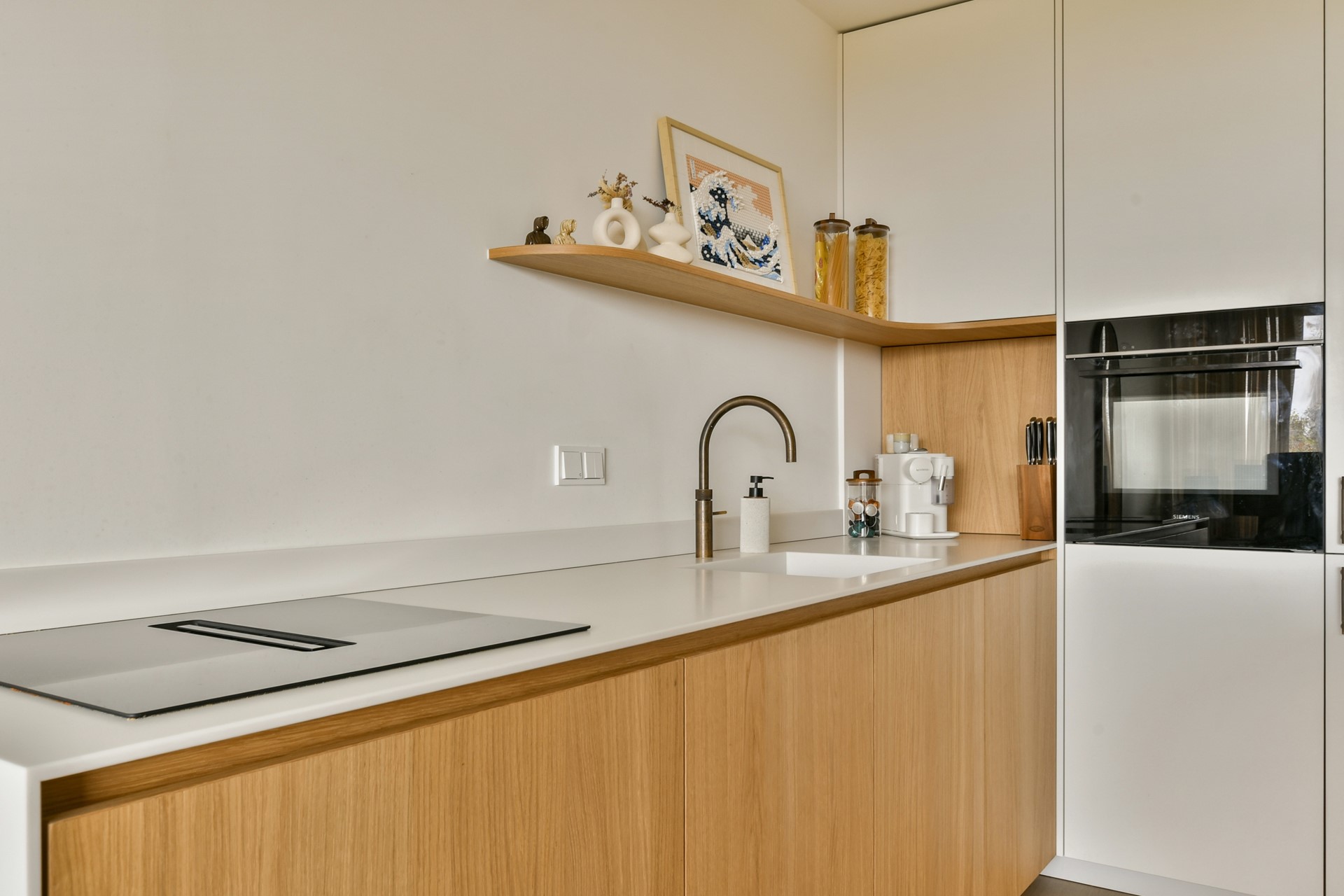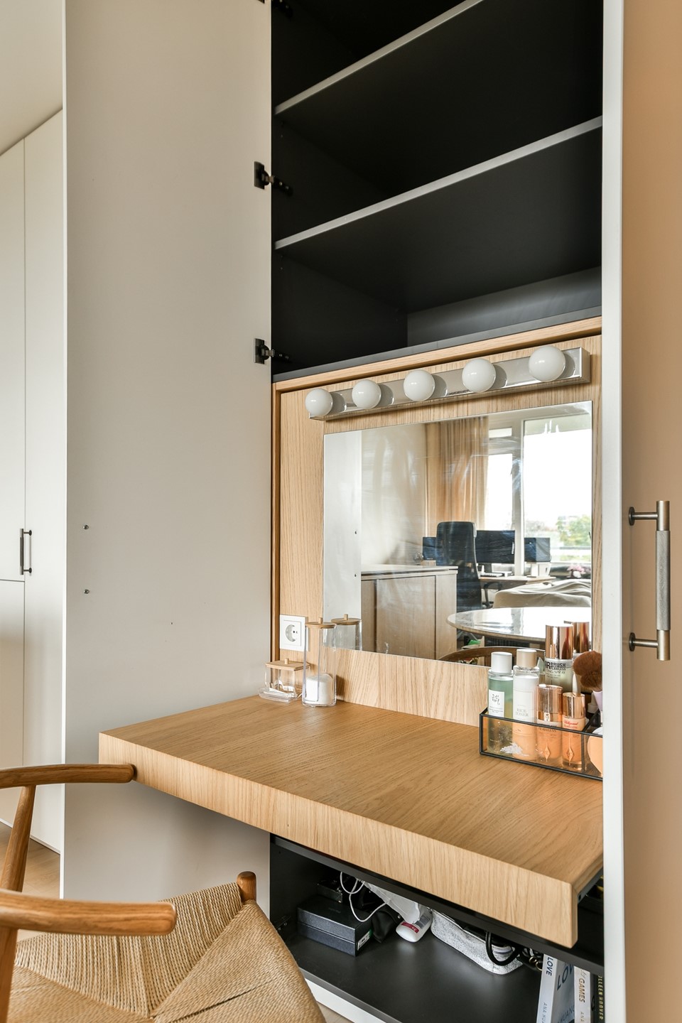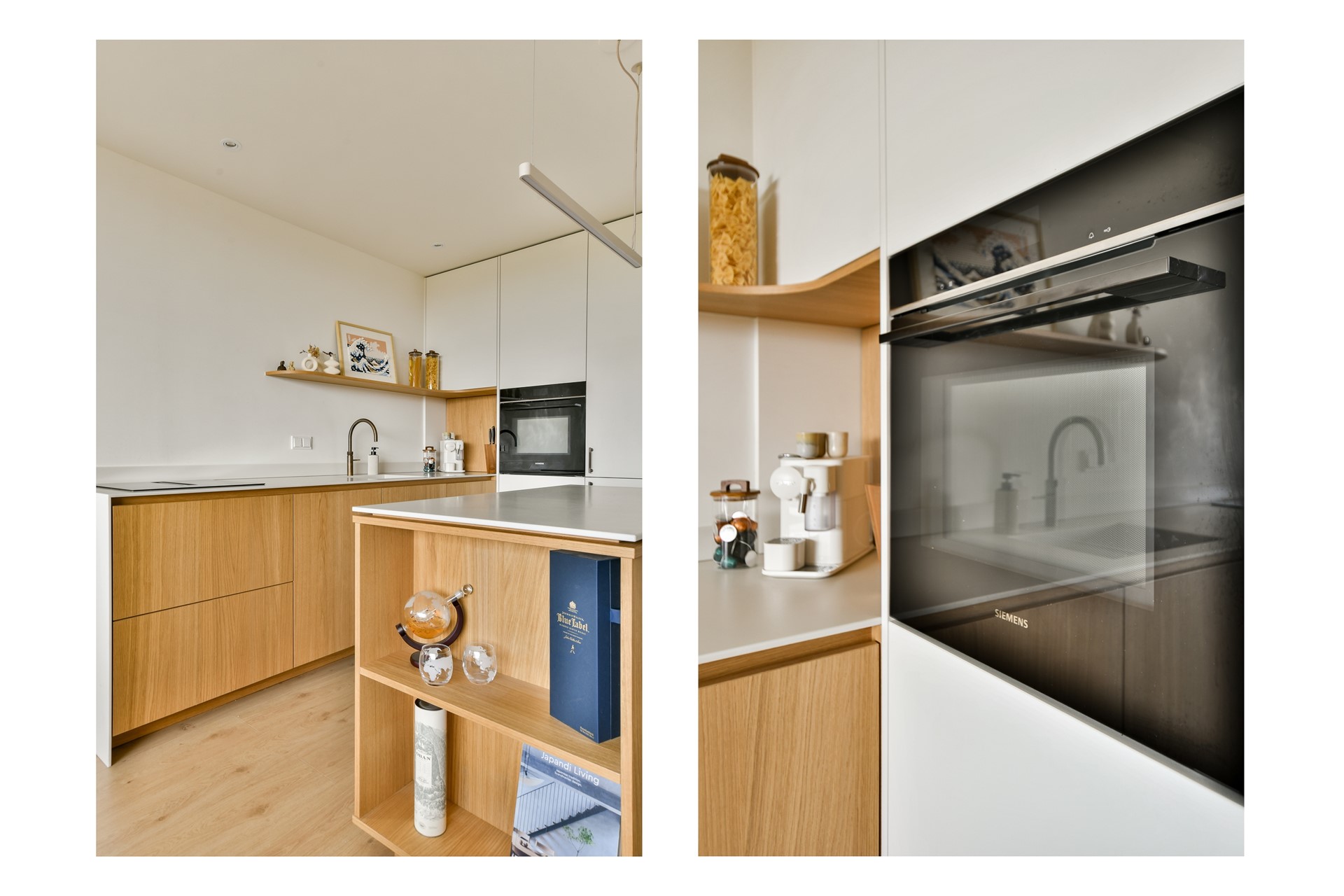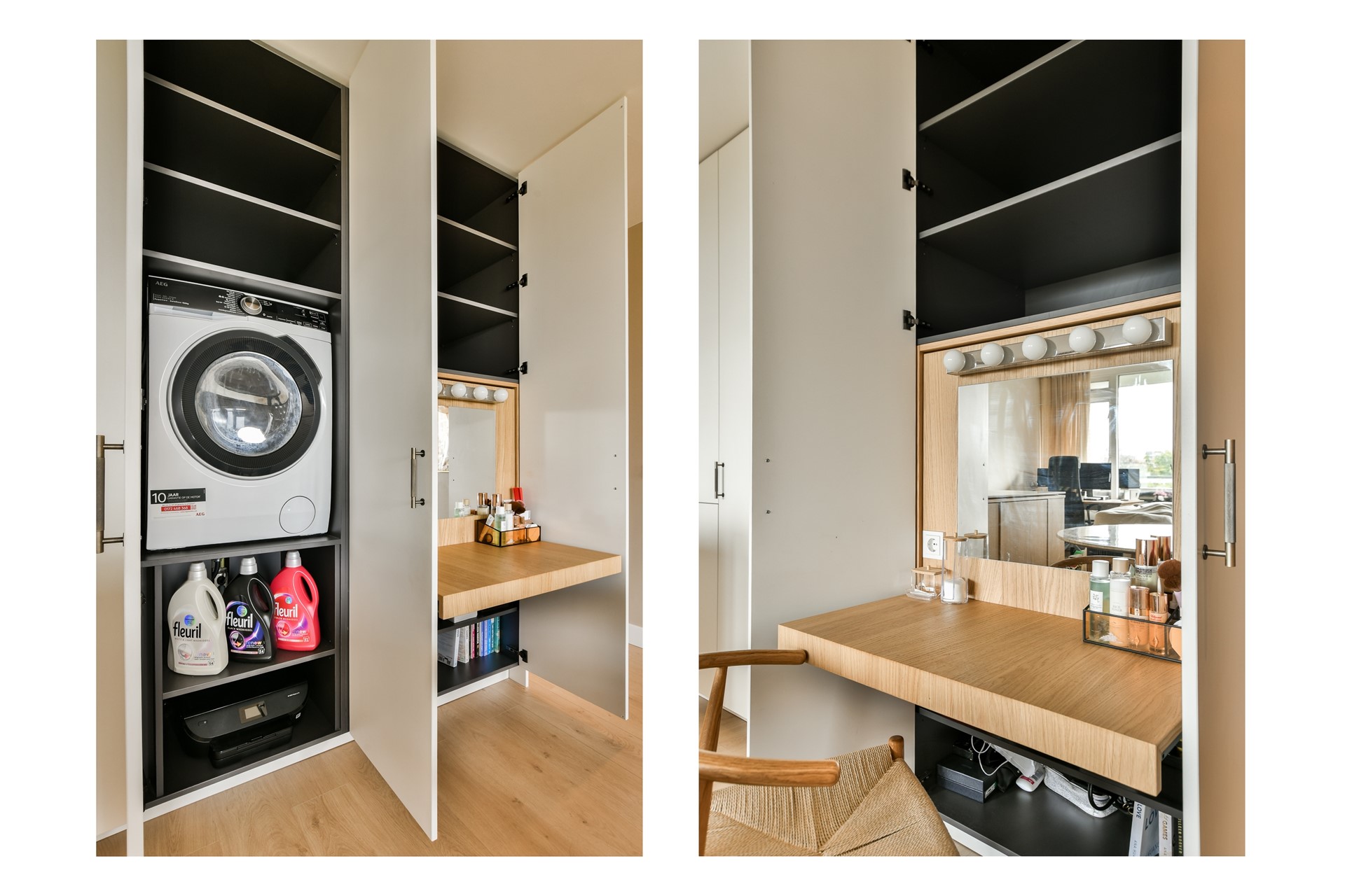 De luxueuze open keuken is uitgerust met een elektrisch fornuis en kookeiland en is van alle gemakken voorzien. In de lange kastenwand met veel opbergmogelijkheden met een ingebouwde wasmachine is eveneens een kaptafel ingebouwd.