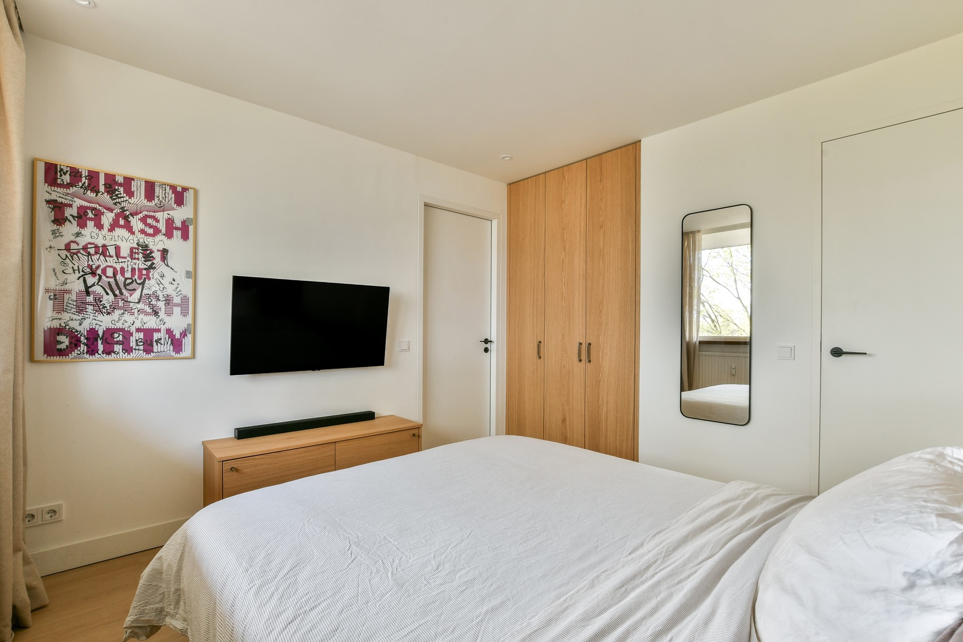 De slaapkamer aan de voorzijde van het appartement gelegen, voorzien van prachtige inbouwkasten.
