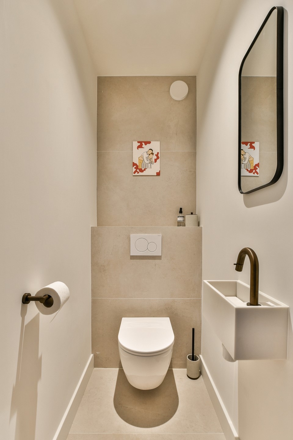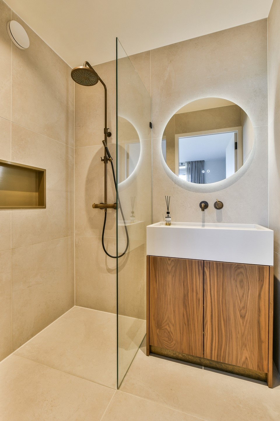 Vanuit de slaapkamer betreed je de badkamer met inloopdouche en een mooi strak vormgegeven wastafelmeubel.